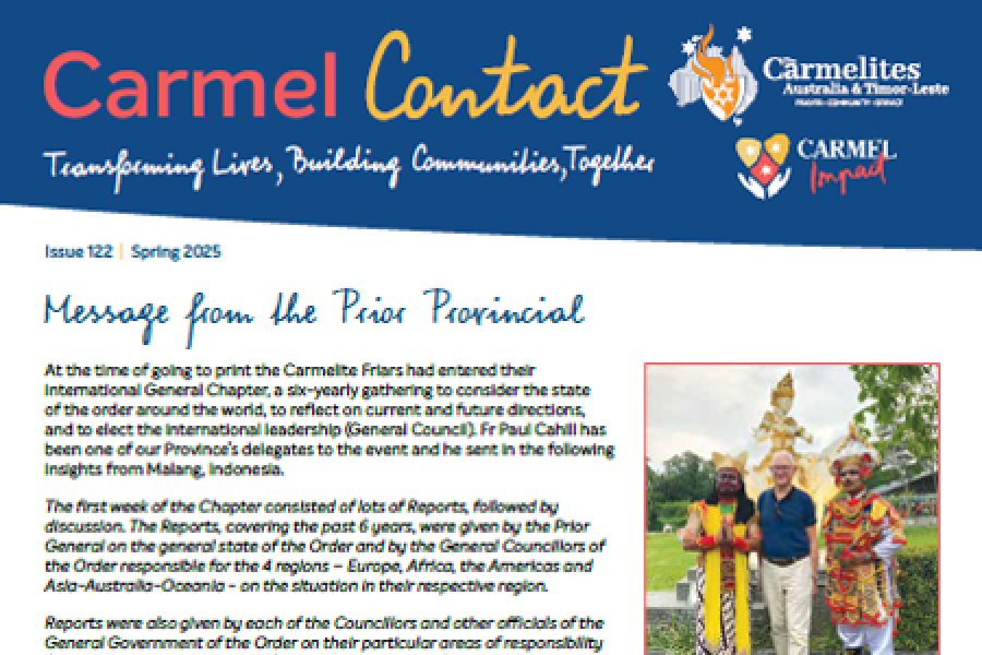 In this issue, Fr Bruce Clark (Prior Provincial) highlights the recent General Chapter held in Malang, Indonesia. A General Chapter is a time to asses the present and plan for the future, a time for both renewal and new beginnings. The Chapter, held in a place where there are a large number of young Carmelites in training, brought a sense of vitality, energy and optimism.
